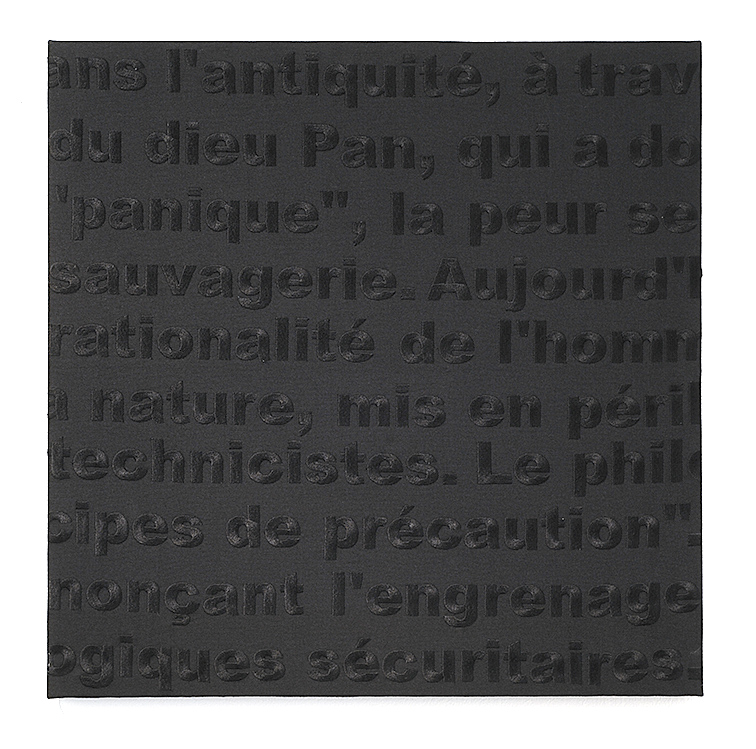 Embroidered Painted. In this serie, the artist questions the language and codes of 20th Century painting. The light is flush with the embroidered words, and this light modifies the readability of each word, according th the movement of viewer. The black color evoques black paintings of K. Malevith. But especialy, the words embroidered in black on black show what the psychoanalyst Lacan called "linguistic collisions".